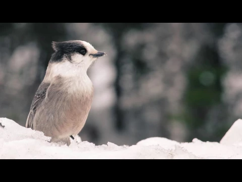The Gray Jay is a frequent visitor to campgrounds and is notorious for begging for scraps from the picnic table. Its song varies from harsh chatter to soft chuckles, or a Quee-oo whistle.